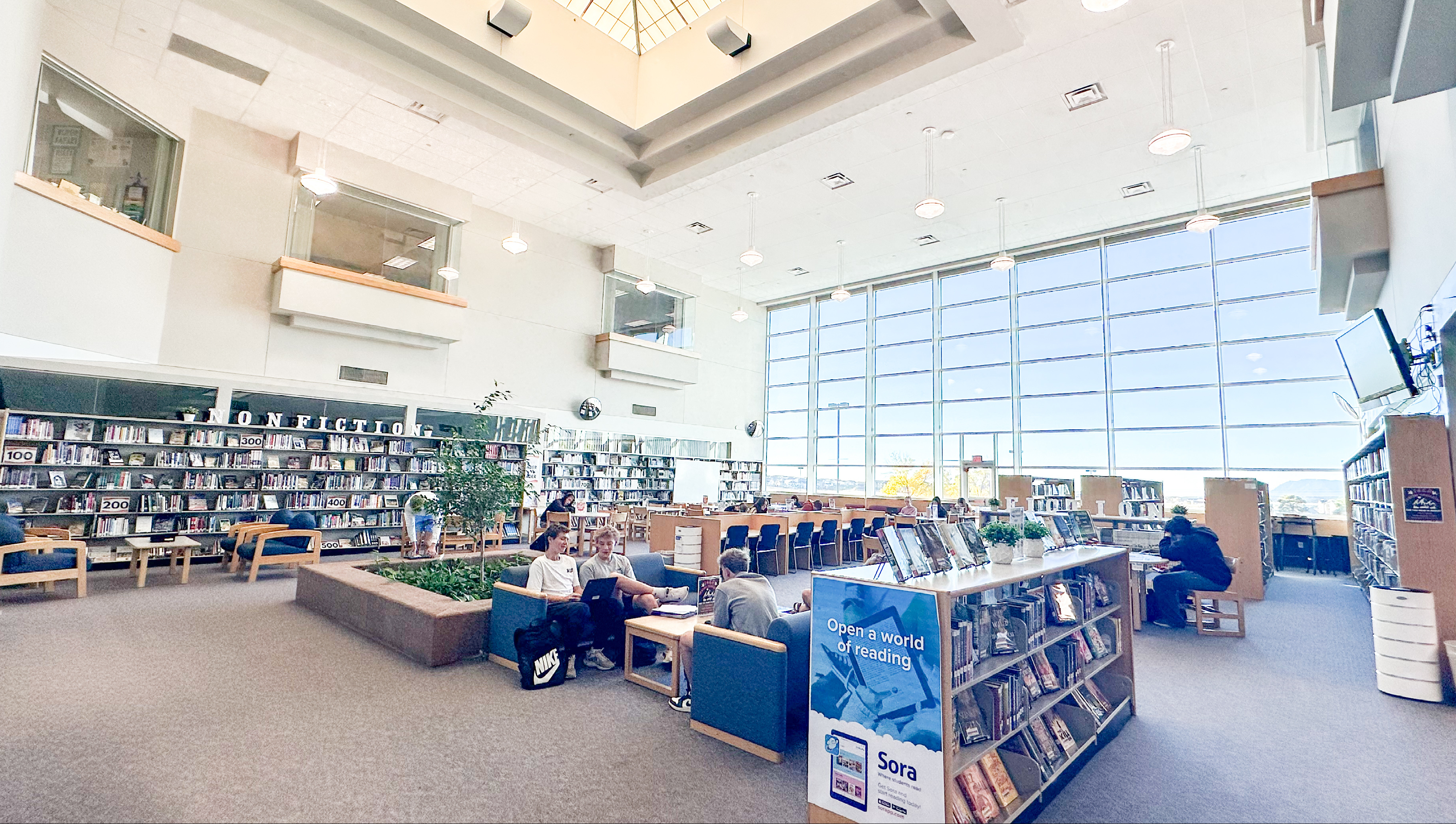 The above image is of the Lewis Palmer High School Library. It contains shelves of books, tables and chairs, students studying, and a wall of windows. There is a small tree in the center of the library and tall ceilings.